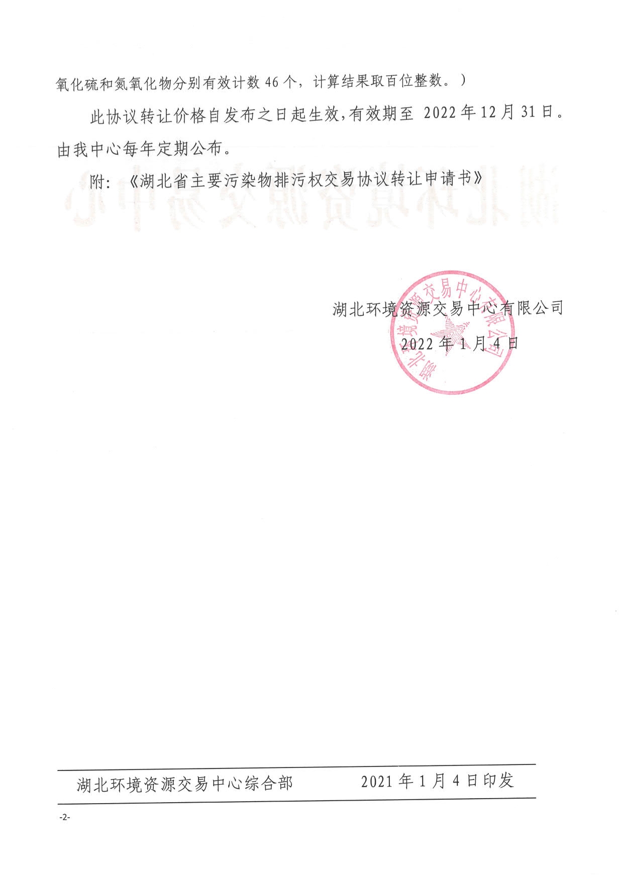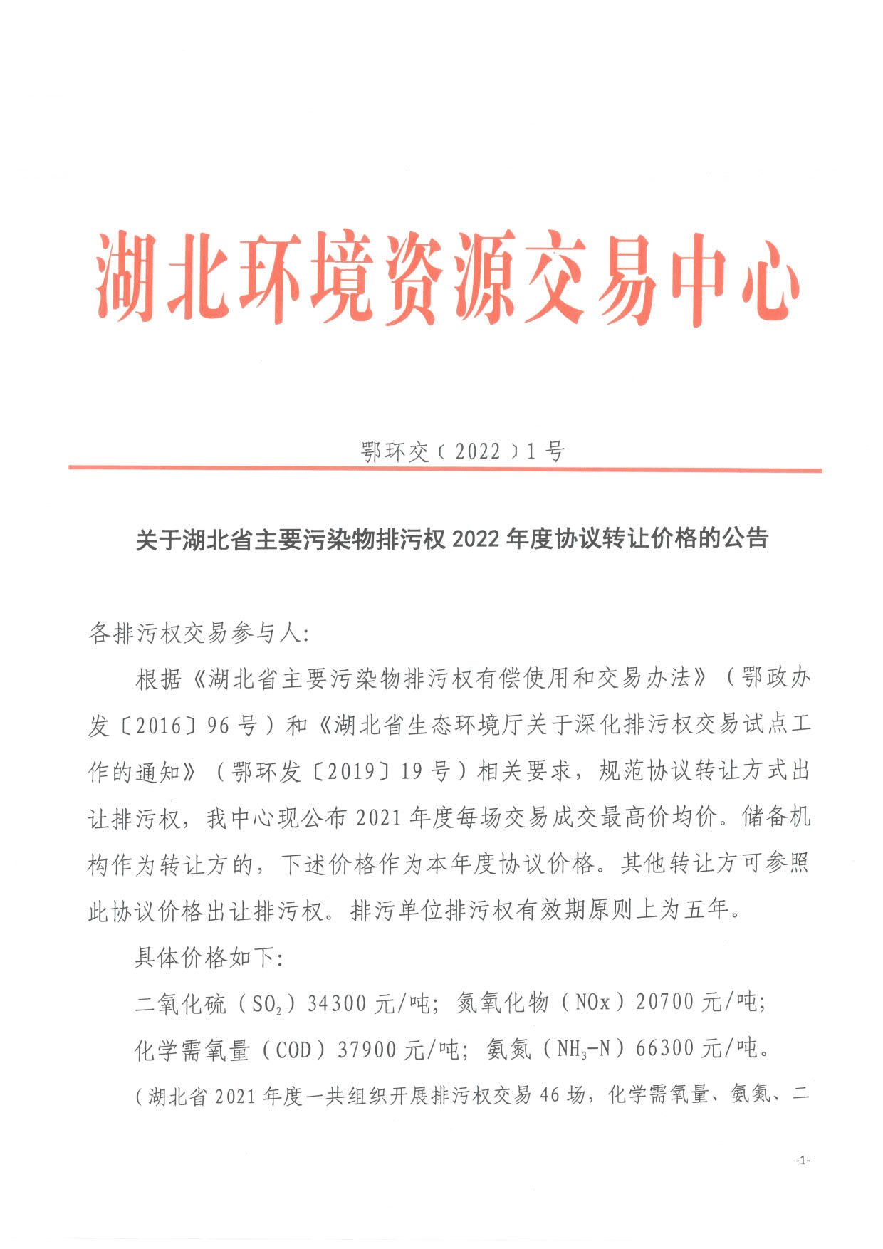 名 称: 关于湖北省主要污染物排污权2022年度协议转让价格的公告 发布日期: 2022年01月21日