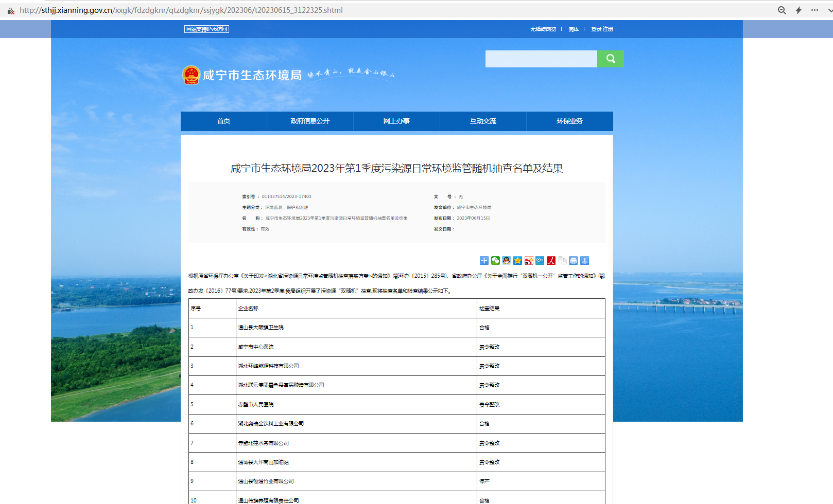 咸宁市生态环境局2023年第4季度污染源日常环境监管随机抽查名单及结果