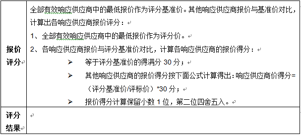 本次询价采取综合评分法(100分制),包括资质审查(否决性审查,不记分)、技术审查(70分),报价审查(30分)三部分。询价小组先对供应商响应资质文件评审,然后对资质文件符合询价文件要求的供应商进入报价文件评审。询价评审工作结束后,两部分合计得分由高到低确定一个供应商(得分最高者),其他有效供应商按合计得分由高到低依次为询价备选供应商。评分细则如下: