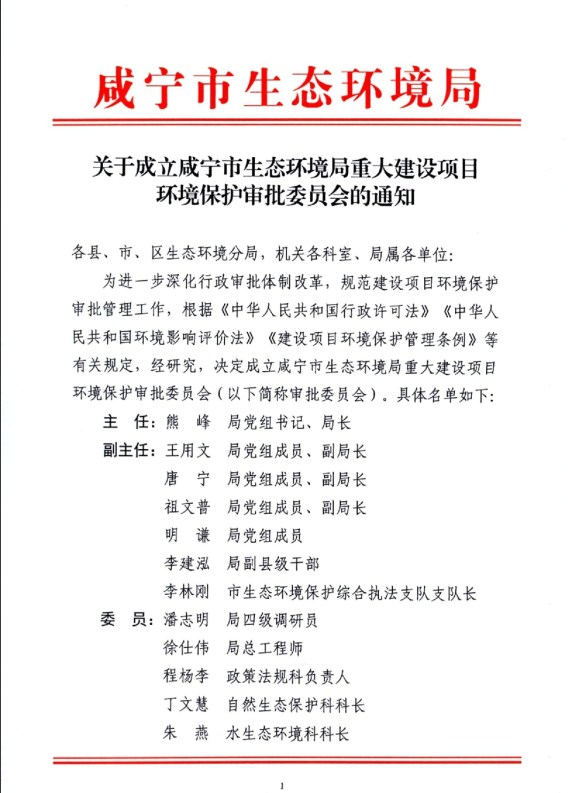 名 称: 关于成立咸宁市生态环境局重大建设项目环境保护审批委员会的通知 发布日期: 2023年05月31日